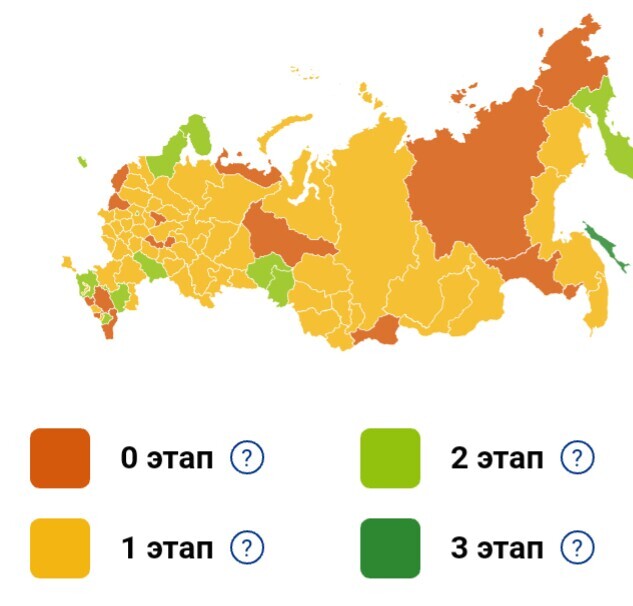 На ней каждый субъект окрашен в один из четырех цветов в зависимости от того, на каком этапе снятия ограничительных мер он находится.