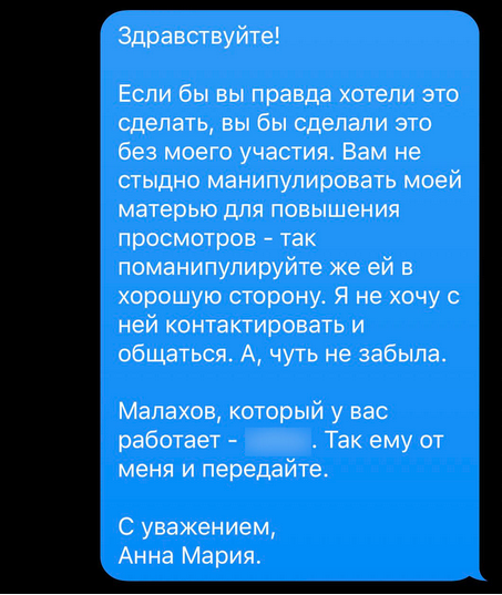 "Я вас очень прошу выйти с нами на диалог, в этой истории никто не хочет наживаться. До безумия грустно смотреть на происходящее", - говориться в сообщении, на которое Анна-Мария Ефремова ответила крайне резко, назвав Андрея Малахова нецензурным словом.