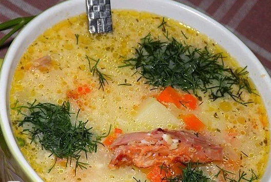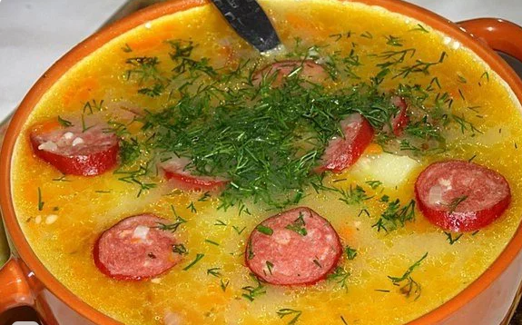 Ароматный супчик с копчёной курицей и плавленным сырком.