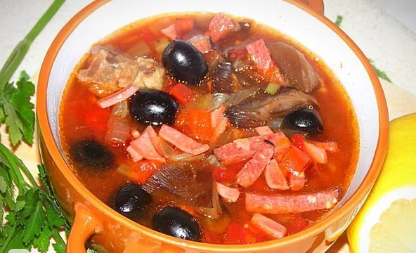 Переложить зажарку в говяжий бульон и добавить нарезанные огурцы и оливки, довести до кипения, выключить и дать солянке настоятся минут 20