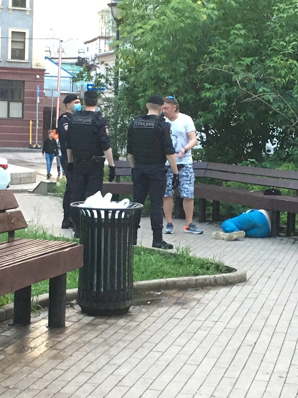 Цветы, зелень, куча людей, все без масок и "труп" под скамейкой.