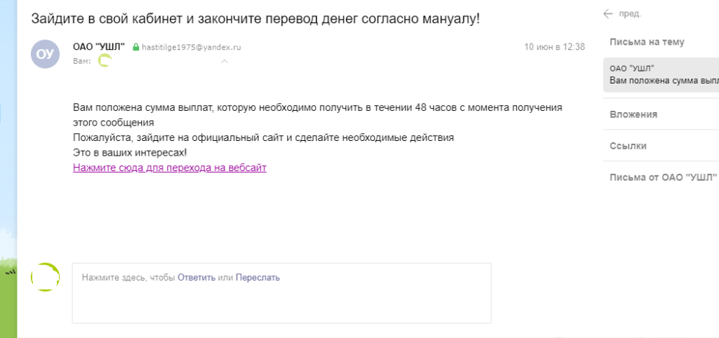 Письмо с обещаниями выплат легко проверить. Наводим мышку на адрес письма (см. картинку синяя стрелка). При этом появляется реальный адрес, с которого письмо пришло. Домен, с которого пришло письмо (обведено красным), вставляем в адресную строку браузера. В нашем случае письмо от "Компенсационного фонда РФ" пришло от какого-то иностранного shop Disney. О какой компенсации от государства Российская Федерация тут можно говорить?