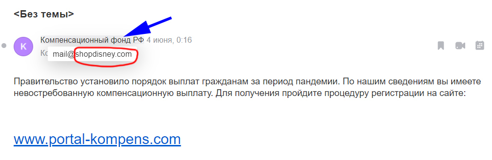 Письмо с обещаниями выплат легко проверить. Наводим мышку на адрес письма (см. картинку синяя стрелка). При этом появляется реальный адрес, с которого письмо пришло. Домен, с которого пришло письмо (обведено красным), вставляем в адресную строку браузера. В нашем случае письмо от "Компенсационного фонда РФ" пришло от какого-то иностранного shop Disney. О какой компенсации от государства Российская Федерация тут можно говорить?