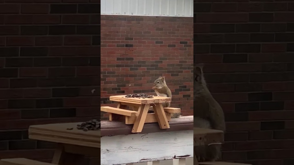 Occurred in June, 2020 / Tiny, Ontario, Canada "My dad built a mini picnic table to feed the birds and little animals. We caught a little squirrel perfectly ...