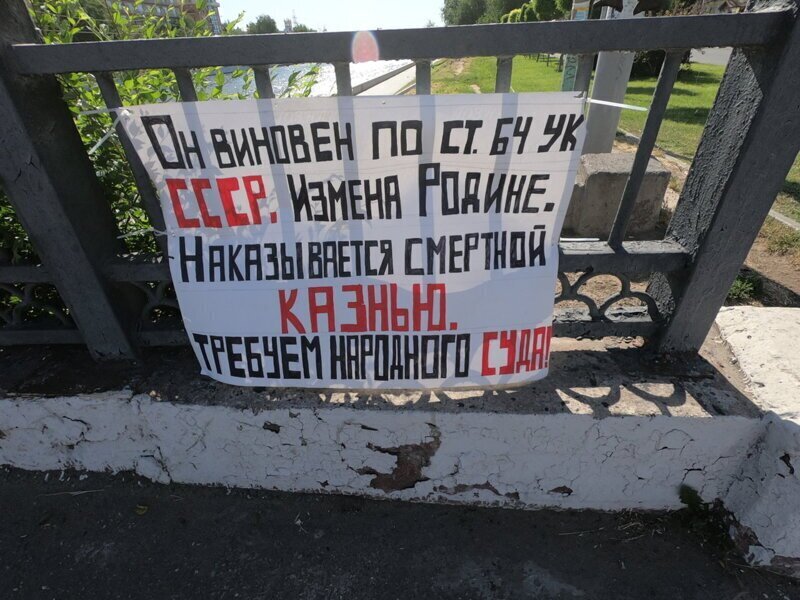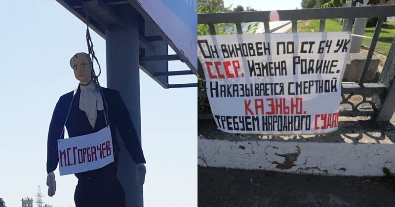 Рядом с манекеном висел плакат с призывом к народному суду. По мнению активистов, экс-президент виновен в измене Родине — по видимому, Горбачеву вменяется развал СССР.
