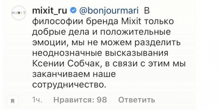 Косметический бренд Mixit, с которым сотрудничала Собчак, разорвал с ней контракт. Об этом компания сообщила в инстаграме.