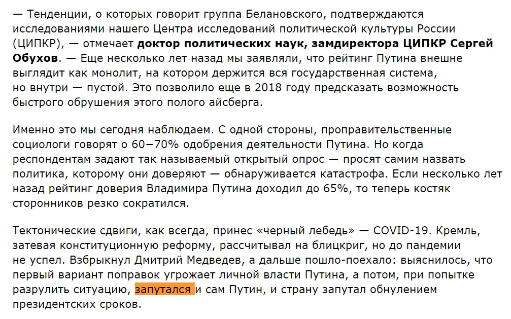 Так вот, в данном случае доктор наук пишет о том, что Путин сначала убоялся угроз своей власти, а при попытке как-то разрулить ситуацию вообще запутался.