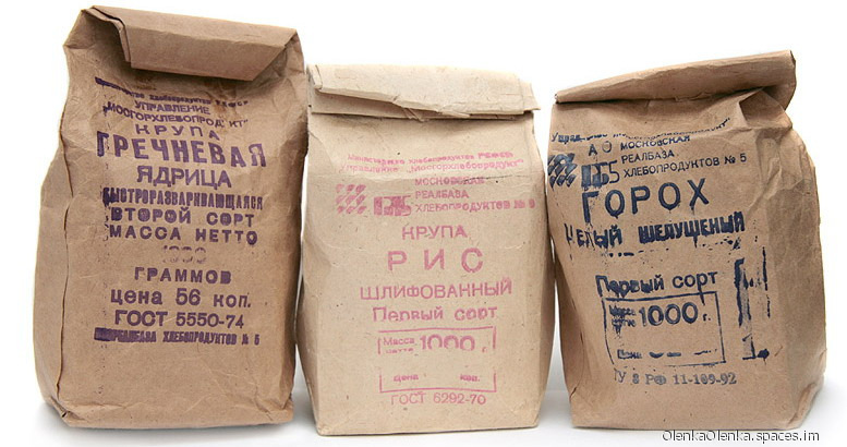 А вот насчет круп дело было проще – горох, пшено, перловка выдавались колхозникам раз в год (по крайней мере, у нас так было). Также и семечки, стоившие в магазине свыше 2 руб./кг. А рис в те времена мы не брали – дороговато относительно остальных круп был. Гречку на праздники выдавали ветеранам Великой Отечественной войны, поэтому иногда благодаря бабушке была у нас и греча, хотя на этот счет у нас «работал» другой канал поставки – родственники из Мурманска. Несколько посылок в год обязательно содержали в себе гречу и консервы «Треска копченая в масле» с золотой верхней крышечкой.