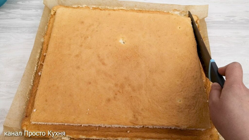 Сначала делаю сироп для пропитки торта, чтобы он успел остыть, пока мы занимаемся тортом. Вливаю в кастрюлю воду и добавляю половину от общей массы сахарного песка (250 гр). Довожу до кипения и растворения сахара, затем добавляю коньяк и выключаю плиту. Спирт испарится и останется только приятный аромат. Сироп готов, отставляем в сторону остывать. Теперь взбиваю яйца со второй половиной сахарного песка (250 гр) до бела и увеличения массы в объеме. Смешиваю с мукой ванильный порошок. Затем за несколько приемов добавляю муку к взбитым яйцам с сахаром. Миксер здесь уже не нужен. Перемешиваем аккуратно, с помощью лопатки, легкими подхватывающими движения. Ни соды, ни разрыхлителя я не добавляю. Берём стандартный противень от духовки и застилаем его пергаментной бумагой. Половину теста (я делаю это "на глаз") выливаю на противень и с помощью лопатки разравниваю по всей поверхности. Ставим в духовку, разогретую до 180 градусов минут на 15 (+/-). Затем достаём и даём коржу хорошо остыть. Со второй половиной теста поступаем точно также и выпекаем второй корж. У остывших коржей ножом обрезаем края, чтобы их выровнять. Затем разрезаем коржи пополам и, таким образом, получаем 4 коржа. Обрезки от бисквита измельчить при помощи блендера или мясорубки.