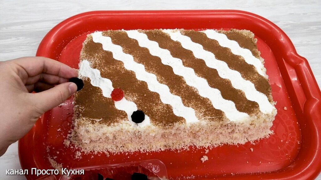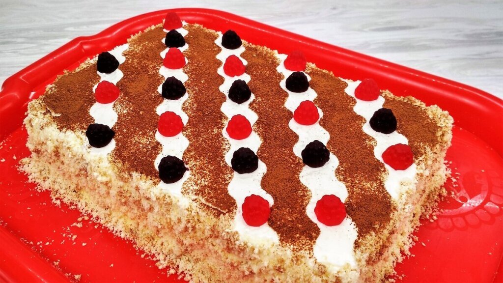 Собираем торт. На тарелку подходящего размера или поднос кладём первый корж и пропитываем его приготовленным сиропом (к этому времени он уже остынет). Пропитанный корж смазываем кремом. И так далее собираем торт, пропитывая каждый корж и смазывая его кремом. Остатками крема смазываем бока и верх торта. Измельченной бисквитной крошкой посыпаем бока тортика. Верх торта можно украсить по своему желанию - фруктами, ягодами, орехами, шоколадом и т. д. Я сегодня использовала вырезанный трафарет и какао порошок, а также мармеладки в виде малинок и ежевик.