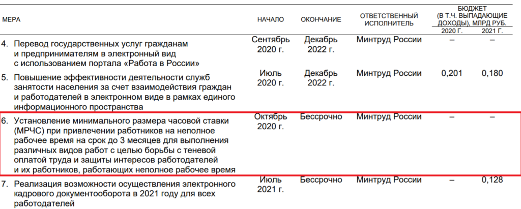 Общенациональным планом действий по восстановлению занятости и доходов населения и росту экономики предусмотрена такая мера, как введение в России минимального размера часовой ставки (МРЧС).