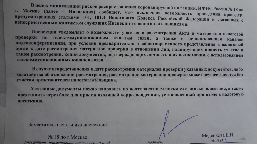 Подавала в январе 2020 года все документы через интернет, в том числе и все справки, на налоговый вычет, используя электронную подпись. Мне сообщили что камеральная проверка прошла успешно. Насчитано 15600 рублей. Далее из за режима самоизоляции налоговая инспекция не работала. В начале июня мне пришёл акт проверки. В акте говорится, что так как я вовремя не предоставила оригиналы справок/справки об оплате лечения/ в налоговую инспекцию, то мне отказано в налоговом вычете. Ранее мне об этом не сообщали. Так же мне прислали извещение о времени и месте рассмотрения материалов налоговой проверки. Так же написана, какая то белиберда о возможном участии в проверке по телекоммуникационным каналам связи..
