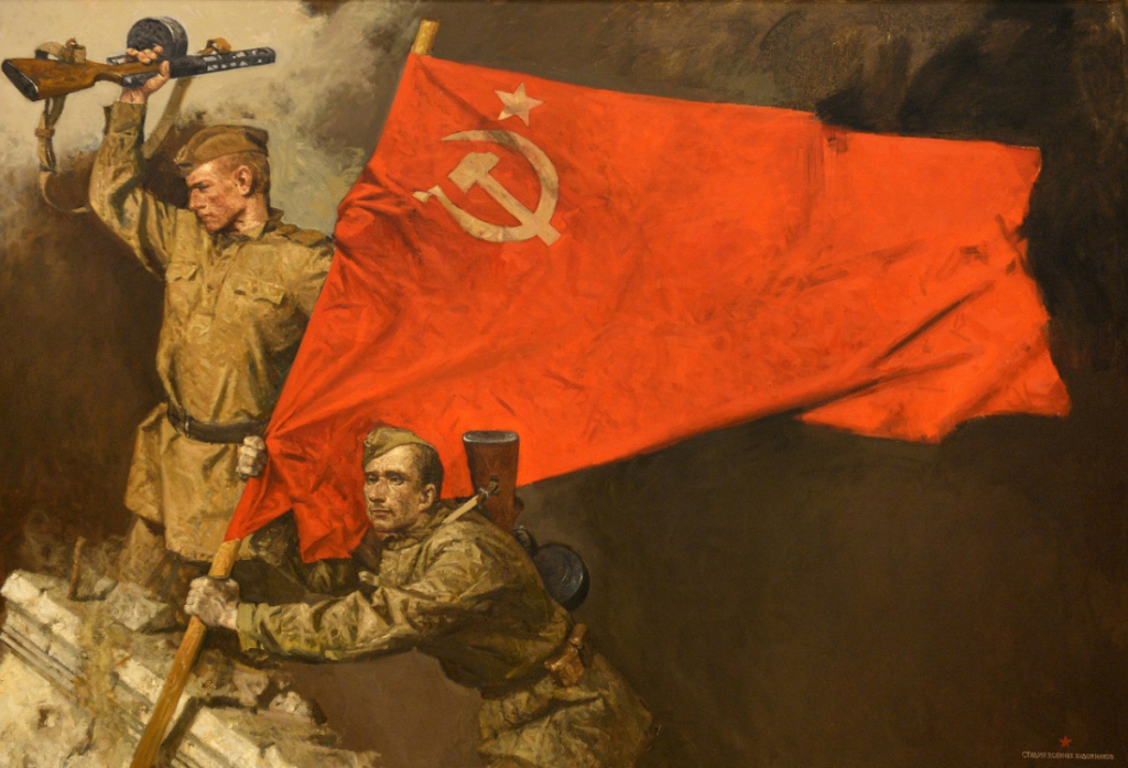 Давайте, дружно в комментариях напишем, на кого похож человек, который держит красное знамя.
