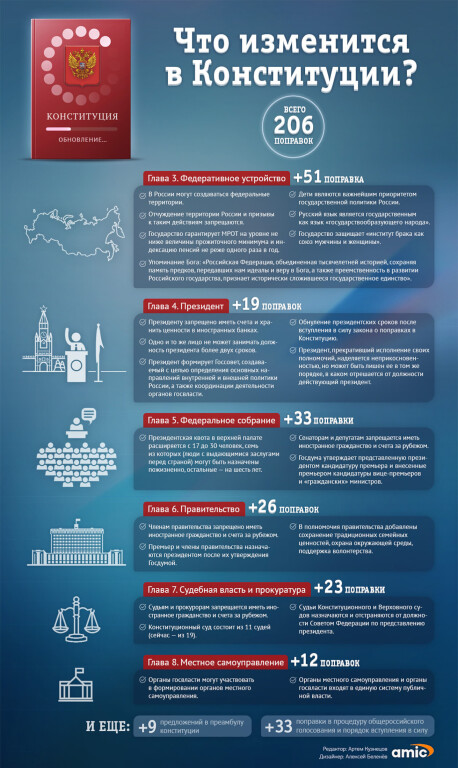 Простите, если лично вас обидел, но прошу заметить, что необходимо прочесть все полторы сотни поправок непосредственно в принятой конституции, посидеть и подумать пяток минут, а только затем писать подобную статью. Черпать информацию из приведенного агитационного плаката, как и из изливаемого из телевизора продукта говорящих голов глупо... И кстати, суть изложенного не может измениться от эмоциональной окраски...