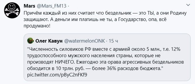 А ваше нытье характеризует вас, как бесполезного человека, который самостоятельно не в силах решить даже собственные проблемы. И при этом считает, что все ему что-то должны... И вместо того, чтоб посмотреть на себя в зеркало и что-то начать менять в своей жизни, сутками сидит в интернете и ноет, как ему и его тёще плохо живётся. Стыд и позор! И единственное на что у вас хватает мозгов, так это тех, кто сам вкалывает и на жизнь не жалуется - обзывать проплаченными троллями... Или вы по себе судите и вам платят за то, что тут сутками говно льёте, как в России плохо жить?