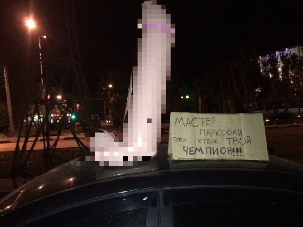 В Белгороде шутники оставили на припаркованном автомобиле гигантский надувной орган. Такой подарок из магазина для взрослых получил водитель автомобиля с курскими номерами, который перегородил тротуар на улице в центре города. «Кубок мастера парковки» и послание неизвестные оставили ночью. Утром надувной агрегат исчез, а табличка осталась. Возможно, подарок для водителя приглянулся кому-то из прохожих.
