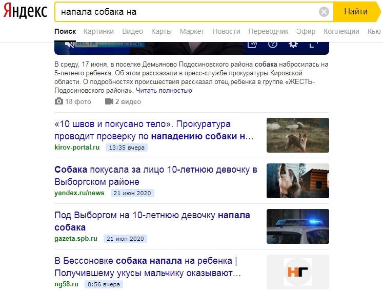 А Вы много видели и слышали историй про неадекватных людей, которые нападают на несчастных, бедных собачек и колют, колют, колют их ножичками? Приведите конкретный пример: где и когда была неспровоцированно заколота собачка. Особенно породы алабай, ротвейлер, немецкая овчарка, питбуль и т.п. С нетерпением ждём, Ольга! Надеюсь, не я один. Мой запрос "напал на собаку с ножом" в интернет, кроме случая в Химках ничего не дал существенного, зато обратный запрос выдал 100500 ссылок. См. фото 1 страницы поискового запроса и это только за последние несколько дней...