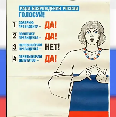 При этом сам Ельцин, который тогда изредка еще находился в хорошей форме, был готов идти на перевыборы. В качестве единственно верного девиза предстоящего всенародного голосования власть предложила звонкую и запоминающуюся речёвку. Как вспоминается сегодня, этот легкий слоган (да-да-нет-да), доносившийся из всех информационных щелей как надоедливая жуж-ж-жащая муха, взирающий с листовок, нарисованный на остановках был выучен людьми назубок – и страна сделала нужный власти выбор.