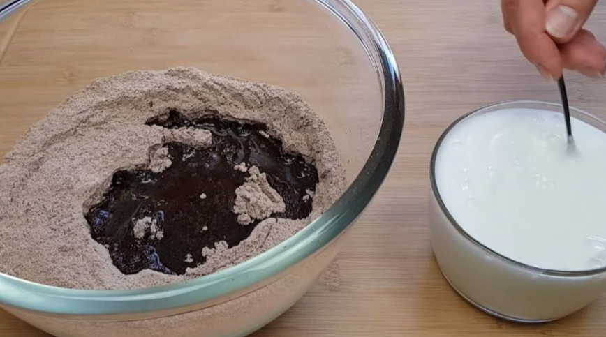 В сухую смесь выливаем 90 грамм или примерно 1/2 стакана объёмом 200 мл растительного масла без запаха. В 250 грамм сыворотки комнатной температуры добавляем 10 грамм или 1 полную ч. ложку соды.