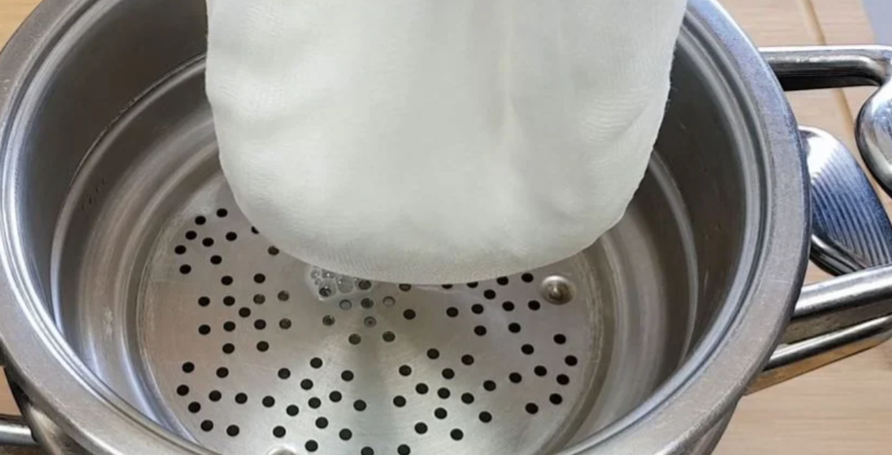 Дуршлаг накрываем марлей, сложенной в 8 слоёв.
