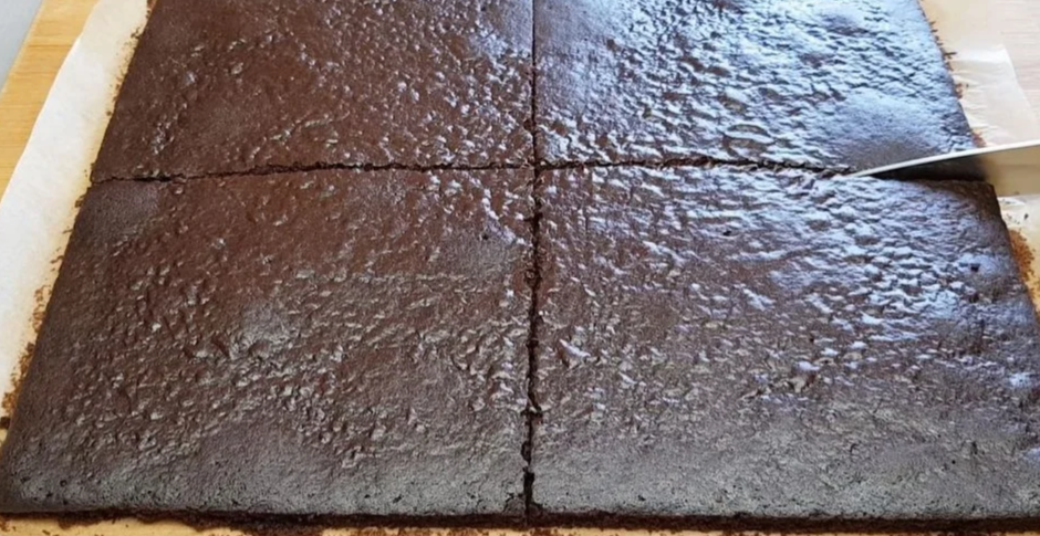 Выливаем всё тесто на противень застланный бумагой для выпечки. Разравниваем. Размер моего противня 39 на 32 см.