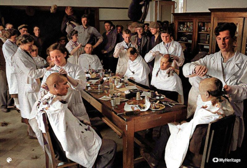 В первые дни войны была массовая мобилизация. В комнате, где стригли солдат, стояла очередь и мужчин, желающих идти на фронт.