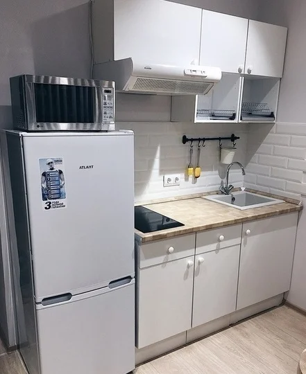 Кстати, что насчет кухни?! А она вполне себе полноценная и удобная. Единственное, чего здесь нет, это духовки, но она оказалась не нужна. Вся остальная техника здесь есть, даже полноразмерный холодильник вместили.