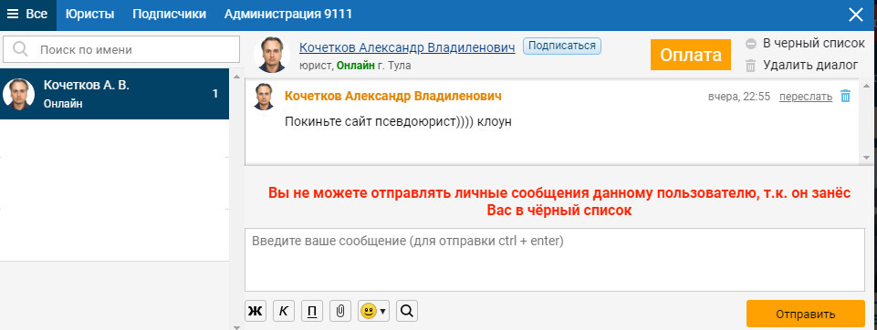 Пример: некий юрист Кочетков Александр Владиленович. Как маленький засранец обозвал и спрятался в "кусты" (за "чёрный список")... И это "юрист"? Ну-ну...