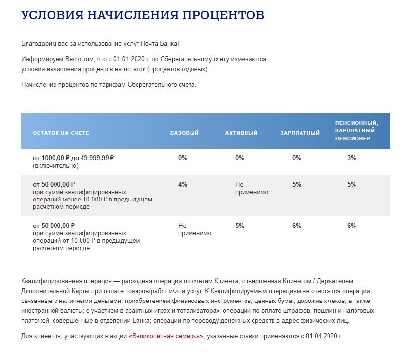 Год назад перевёл свою пенсию на карту МИР ПОЧТА БАНКА. С 01.01.20. ПБ внес изменения в условия начисления %. И рекламируемые 6% на остаток для большинства клиентов стали нереальными из-за того, что многие обычные операции ПБ стал считать порочными, стремясь дать клиентам лишь 3%. Я считал, что пенсию, заработанную за 48 лет стажа я могу расходовать по своему усмотрению. Но оказалось, что отправить денег внуку - это порочная операция и меня за это накажут снижением %. И у меня появилась мысль, что это изменение ПБ "пробный шар", затем могут появиться другие порочные операции, типа: покупка сигарет, мяса... А потом это применят и в других банках. www.pochtabank.ru