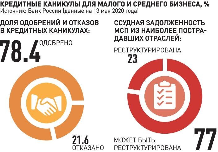 К середине мая малые и средние предприятия (МСП) подали более 106 тысяч заявок на реструктуризацию кредитов, отмечают в Банке России. Доля одобренных заявок составила 78,4%. Объем задолженности по реструктурированным кредитам субъектов МСП - 483,2 млрд рублей. Тот же показатель в рамках конкретно кредитных каникул - 85,8 млрд рублей, это около 23% суммарного кредитного портфеля субъектов МСП из соответствующих секторов экономики.