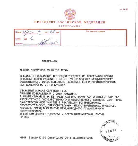 Начнем с того, что 2 марта 2018 года на вопрос журналистов, о чем сожалеет Путин больше всего, он заявил, что о распаде СССР. И здесь же, в этот же день, им направлена поздравительная телеграмма в честь Дня рождения М.Горбачеву со словами восхищения и благодарности в содеянном. Другими словами: «я сожалею о распаде СССР, но глубоко почитаю человека, который это сделал, потому и не отправил его под суд».