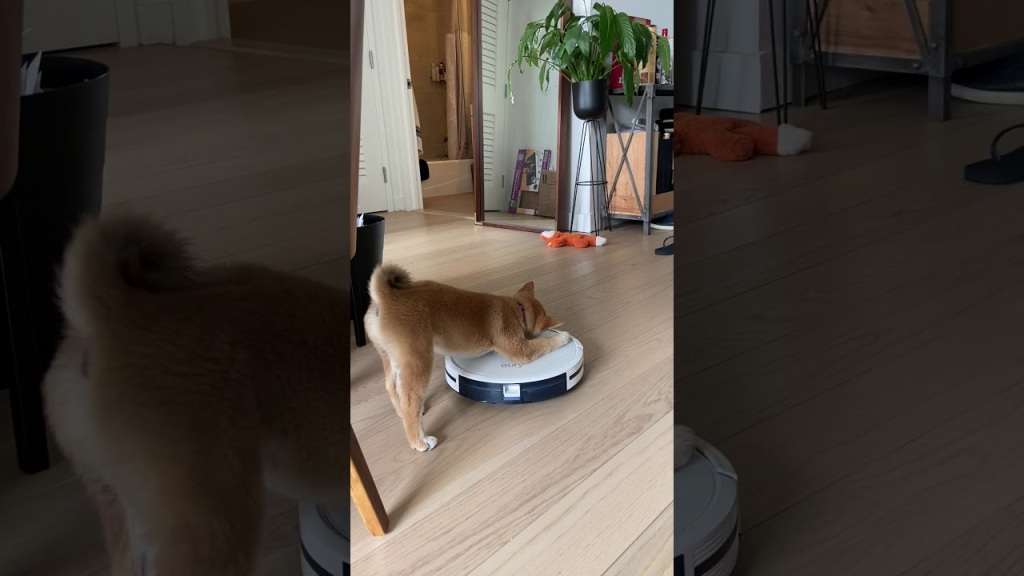 Occurred on May 18, 2020 / New York, New York, USA "Yukita, a Shiba Inu puppy tries to play with a robot vacuum cleaner while it is on at home. Of course, sh...