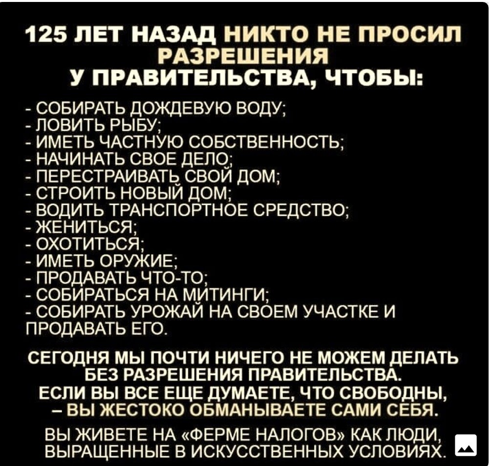 Лидия Викторовна! Вы внимательней ознакомьтесь с перечнем того, на что надо сегодня просить разрешение у власти. Вам не кажется абсурдность большинства этих требований? С этого года введен налог на использование подземных вод. Еще достаточно много деревень, где еще пользуются колодцами для водопользования. Интересно, с этих хозяйств тоже будут взимать этот налог?