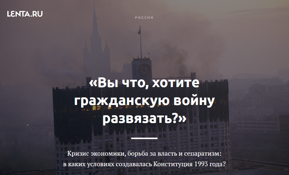 Этот документ, принятый в 1993 году, создавался в тяжелейших условиях: упадок экономики, борьба за власть между Борисом Ельциным и его противниками из Верховного Совета, нависшая над страной угроза отделения территорий и самый трагичный эпизод — боевые действия в столице России. «Лента. Ру»решила вспомнить, как создавалась российская Конституция и что о событиях тех лет говорили те, от кого зависела судьба страны.