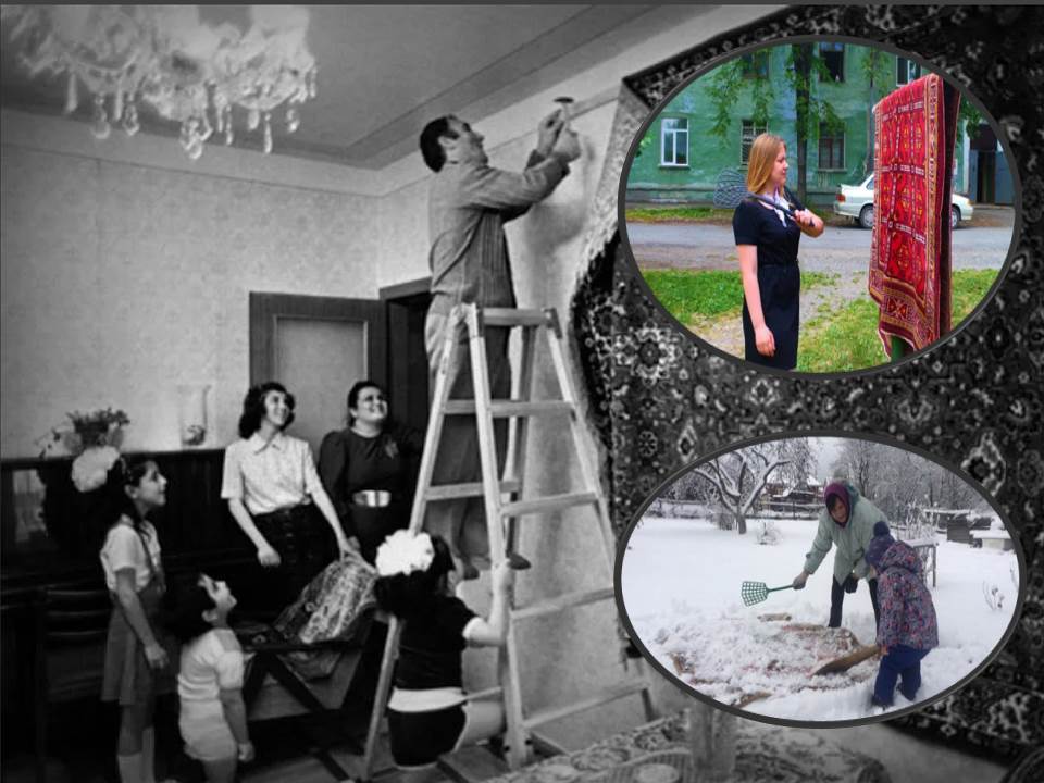 В мои обязанности входило раз в неделю снять большой палас в «зале» (так называется неприкасаемая комната в трехкомнатной квартире обычной советской семьи:-), отнести на улицу и вытрясти. Для этого следовало перемахнуть его через металлическую трубу, а затем хлопать до изнеможения. Потом свернуть и притащить обратно – на 9-й, между прочим, этаж, а лифт почти никогда у нас не работал! А зимой – разложить на снегу, сначала засыпать этим снегом, а после веником его разгребать.