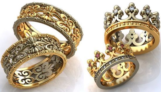 С годами менялась жизнь, нравы, благосостояние наций - менялось и отношение к обручальным кольцам. Сегодня мы воспринимаем обручальные кольца не как что-то магическое или ритуальное, а как вполне себе достойное украшение, стилизованное под вымышленные традиции разных стран. Были времена, когда в обиходе были обручальные кольца из кожи, дерева, камня. Сейчас же в качестве материалов для обручальных колец используются, в основном, драгоценные металлы.