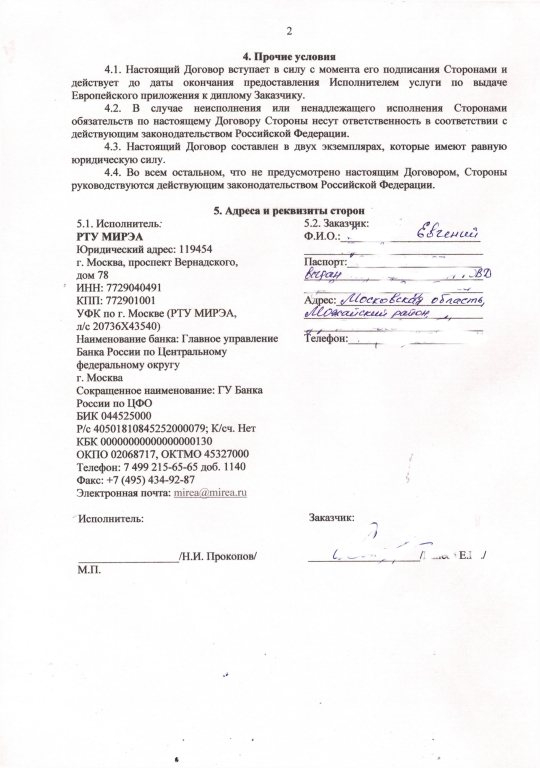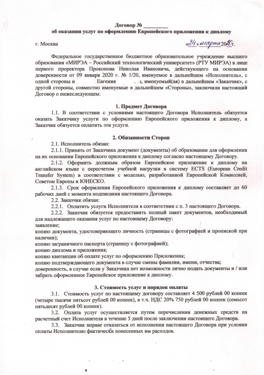 Российский технологический университет-МИРЭА изъявил желание растогрнуть оплаченный в размере 4500 руб. (+ банковские сборы) Договор об оказании услуги по оформлению Европейского приложения к диплому в одностороннем порядке. Причина -- с последнего e-mail озвучивается так: