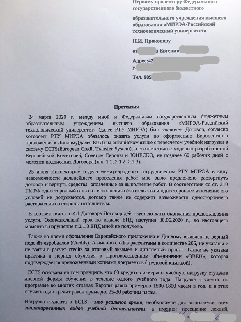 Исполнителем Претензия получена 14.07.2020, готовится иск к МИРЭА