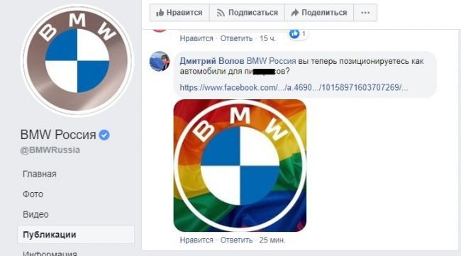 Подкрашивание логотипа германского автоконцерна BMW в цвета, символизирующие половые отклонения, вызвало взрыв издёвок со стороны российских интернет-пользователей.