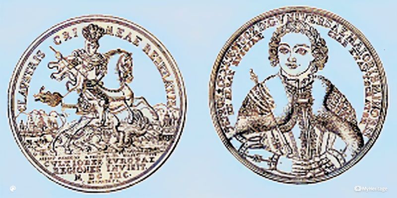 - Позже по случаю победы в Полтавской битве, также была выбита медаль с изображением Самсона. Еще раньше была выбита медаль по случаю «Великого посольства», на которой изображен всадник, поражающий змия. Изображение не характерно для тех времён - Георгий Победоносец всегда изображался без головного убора и без доспехов, а на медали полноценный рыцарь западноевропейского образца.