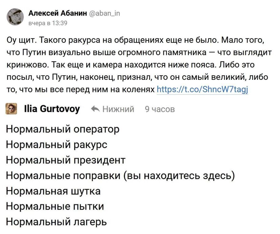 В своём последнем рекламном ролике за голосование по поправкам в Конституцию, названном почему-то обращением к народу, Владимир Путин стал больше памятника, при своих весьма скромных физических размерах. Похоже, визуальный обман в действительности полностью реален.