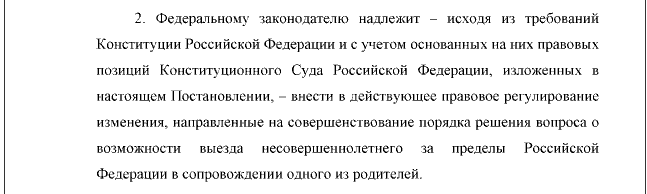 Т.е теперь судебного порядка по части 1 статьи 21 указанного ФЗ, где "в случае, если один из родителей, усыновителей, опекунов или попечителей заявит о своем несогласии на выезд из Российской Федерации несовершеннолетнего гражданина Российской Федерации, вопрос о возможности его выезда из Российской Федерации разрешается в судебном порядке", благодаря постановлению КС РФ не будет. Будет создан внесудебный порядок снятия ограничений и запретов по несовершеннолетним (в части, касающейся въезда и выезда).