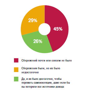 Почти или совсем не было сбережений у 45% россиян. Еще у 29% граждан были накопления, но их оказалось недостаточно для того, чтобы пережить этот сложный период. А так называемая финансовая подушка безопасности, которая позволила прожить в самоизоляции, даже если бы они потеряли все источники доходов, оказалась только у 26% жителей страны. Но даже среди тех, у кого были накопления, проблемы с деньгами во время самоизоляции возникли у 38% опрошенных.