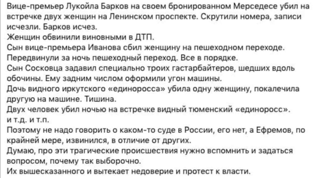 Закон должен быть для всех одинаковым. Снисхождение с оглядкой на неприкасаемых неэтично. В случае с Ефремовым пусть адвокаты роют землю и в рамках закона добиваются самого минимального наказания. Это будет гораздо честнее.