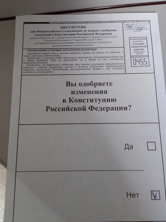 Евгения! То, что вы против поправок это хорошо, но ходить туда не надо было, им нужено было не ваши за или против, им нужны были данные вашего паспорта, присутствие, и подпись и этого этим тварям было достаточно чтобы за Вас пос тавить ДА, а ваше мнение им по барабану. У Вас есть интернет куда Вы смотрели и чем думали Я не знаю...