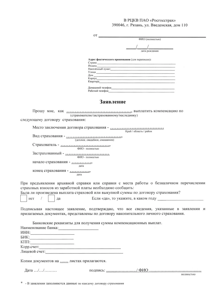 В заявлении следует указать, по возможности, более полные сведения о договоре (Ф. И. О. страхователя и застрахованного, место заключения договора страхования, вид страхования, приблизительные даты начала и окончания срока действия договора). По этим данным специалисты производят поиск договора страхования в электронной базе данных ПАО СК «Росгосстрах». В случае отсутствия договора страхования, следует иметь ввиду, что все первичные документы по закончившимся договорам страхования и по договорам, по которым была проведена выплата страховой или выкупной суммы, уничтожены в связи с истечением срока исковой давности (статья 196 ГК РФ).
