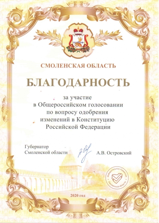 Всем проголосовавшим вручают грамоты от Губернатора Смоленской области А.В. Островского