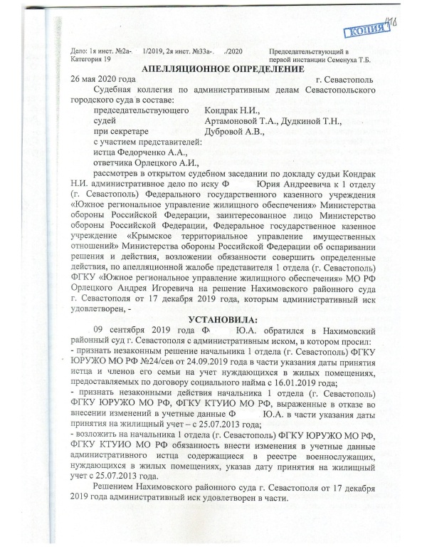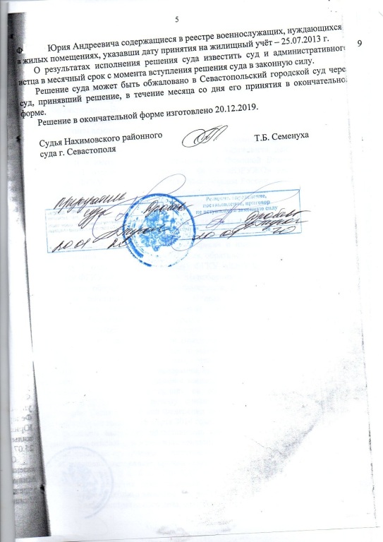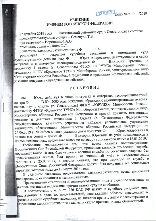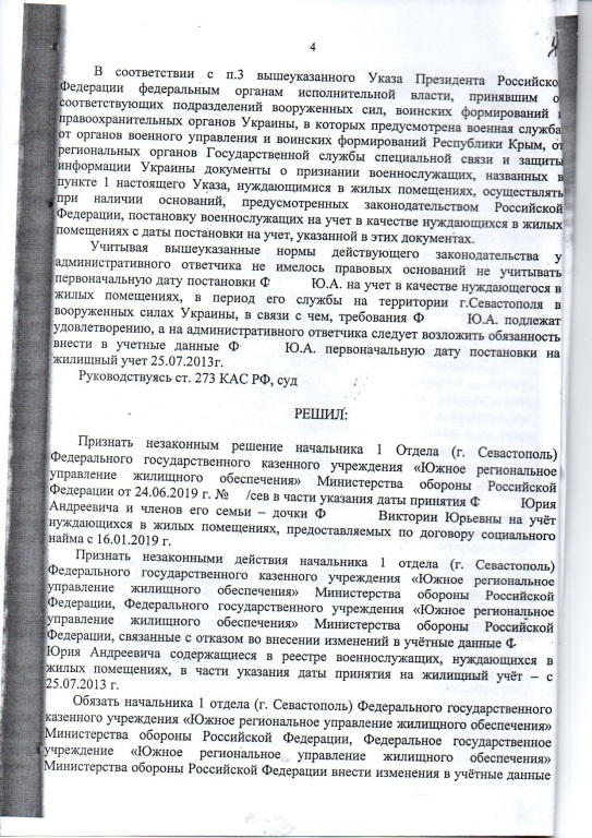 Решением Нахимовского районного суда г. Севастополя от 17.12.2019 г., административное исковое заявление удовлетворенно в полном объёме, на 1 Отдел ФГКУ «ЮРУЖО» МО возложена обязанность внести изменения в учётные данные Клиента, указавши дату принятия на жилищный учёт – 25.07.2013 г. (дата принятия на жилищный учёт во время прохождения военной службы в ВС Украины).