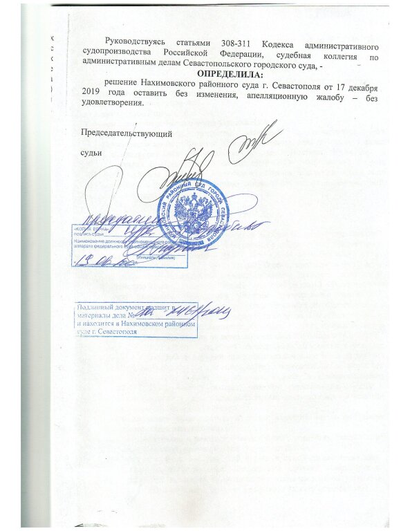 Апелляционным определением Севастопольского городского суда от 26.05.2020 г. в удовлетворении апелляционной жалобы административного ответчика отказано, решение суда первой инстанции оставлено без изменений.