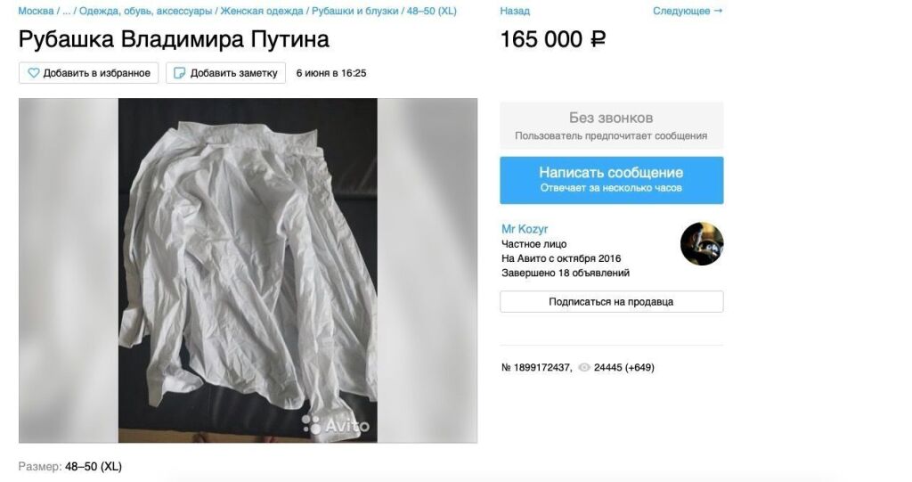 На популярном сайте частных объявлений появилось сообщение о продаже рубашки президента, которая якобы была забыта в отеле Sheraton в Нижнем Новгороде. Цена находки — 165 тысяч рублей.